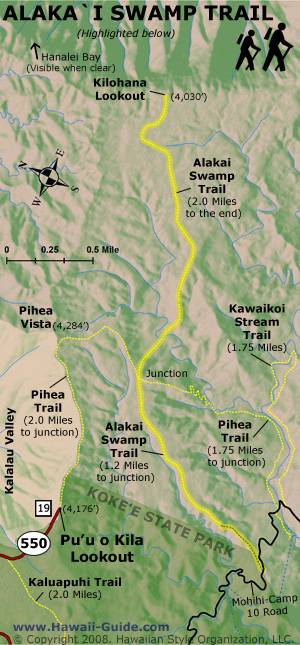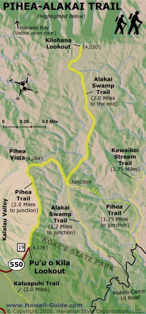 To help clarify this junction and the two trails, we've created three maps: one is a Pihea Trail map alone, one an Alakai Swamp Trail map alone, and one that shows the preferred route that combines the two (from Pu`u o Kila at the end of Highway 550 to Kilohana lookout), here known as the Pihea and Alakai Junction Trail map.